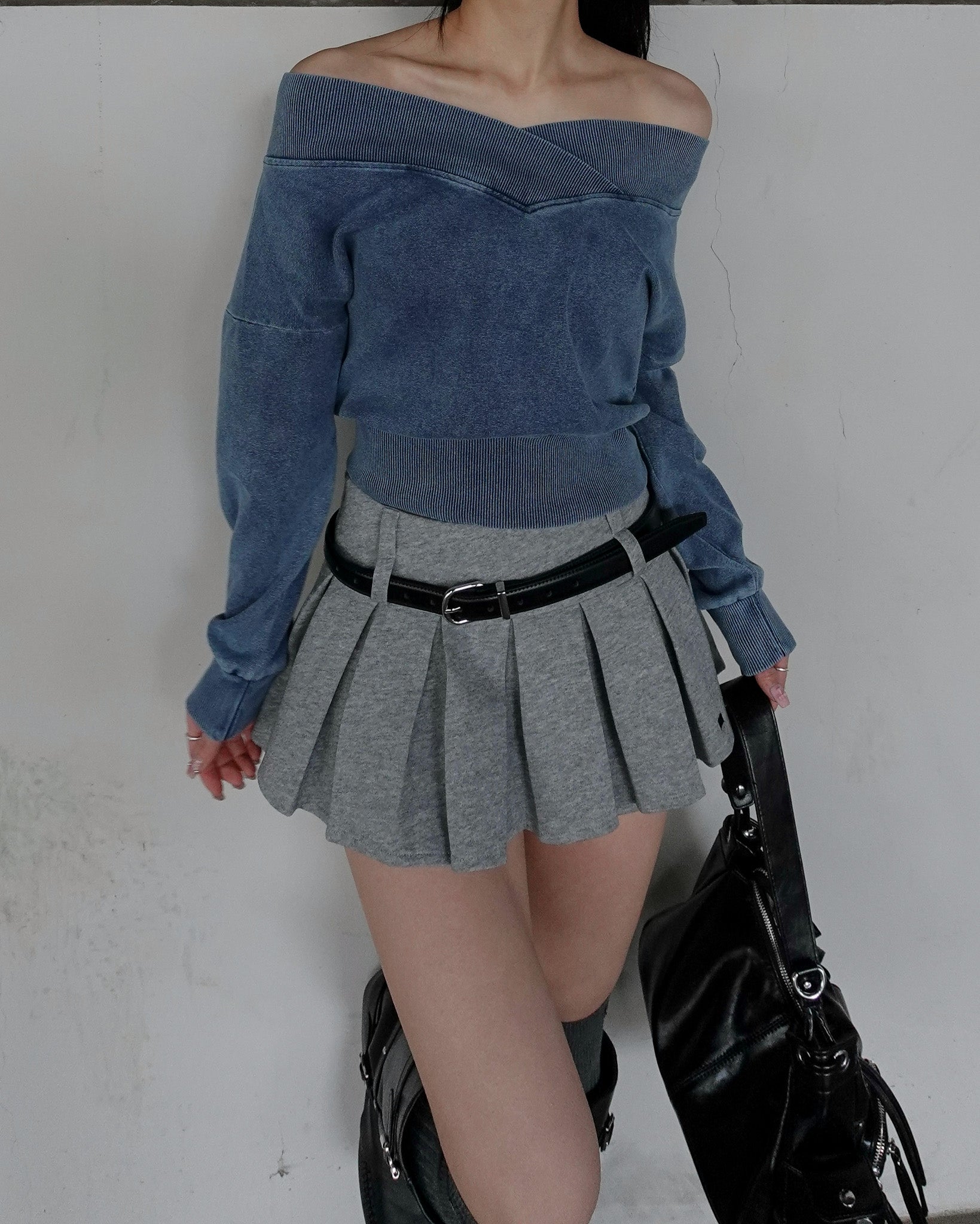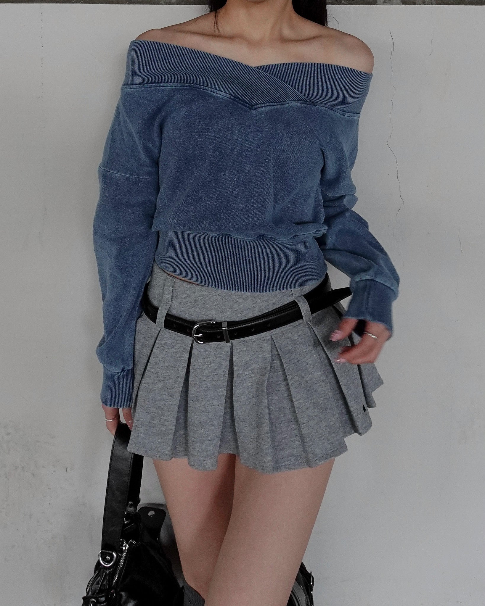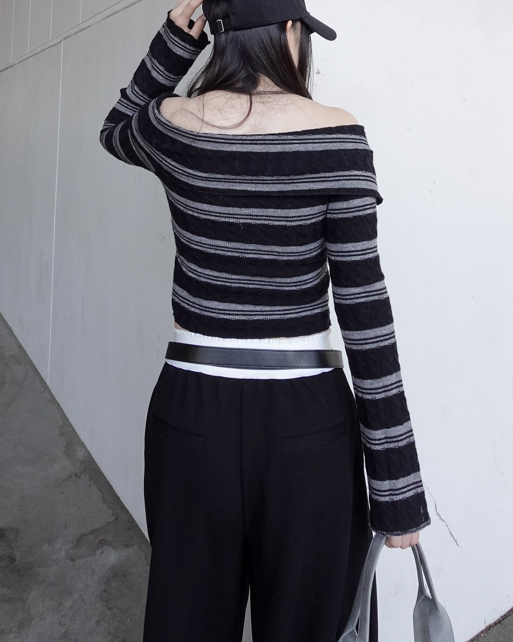 ショート丈のオフショルダートップス。