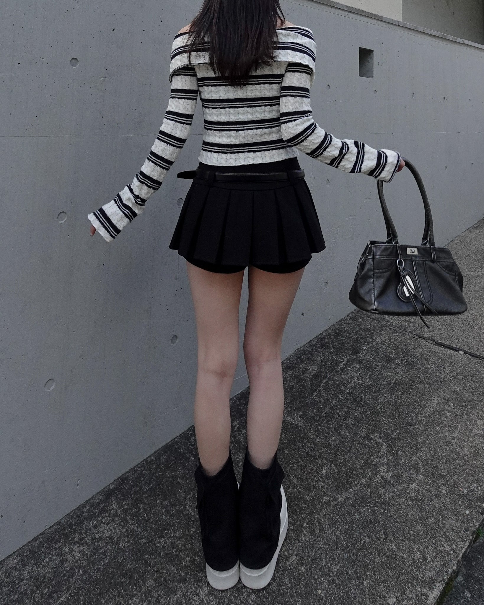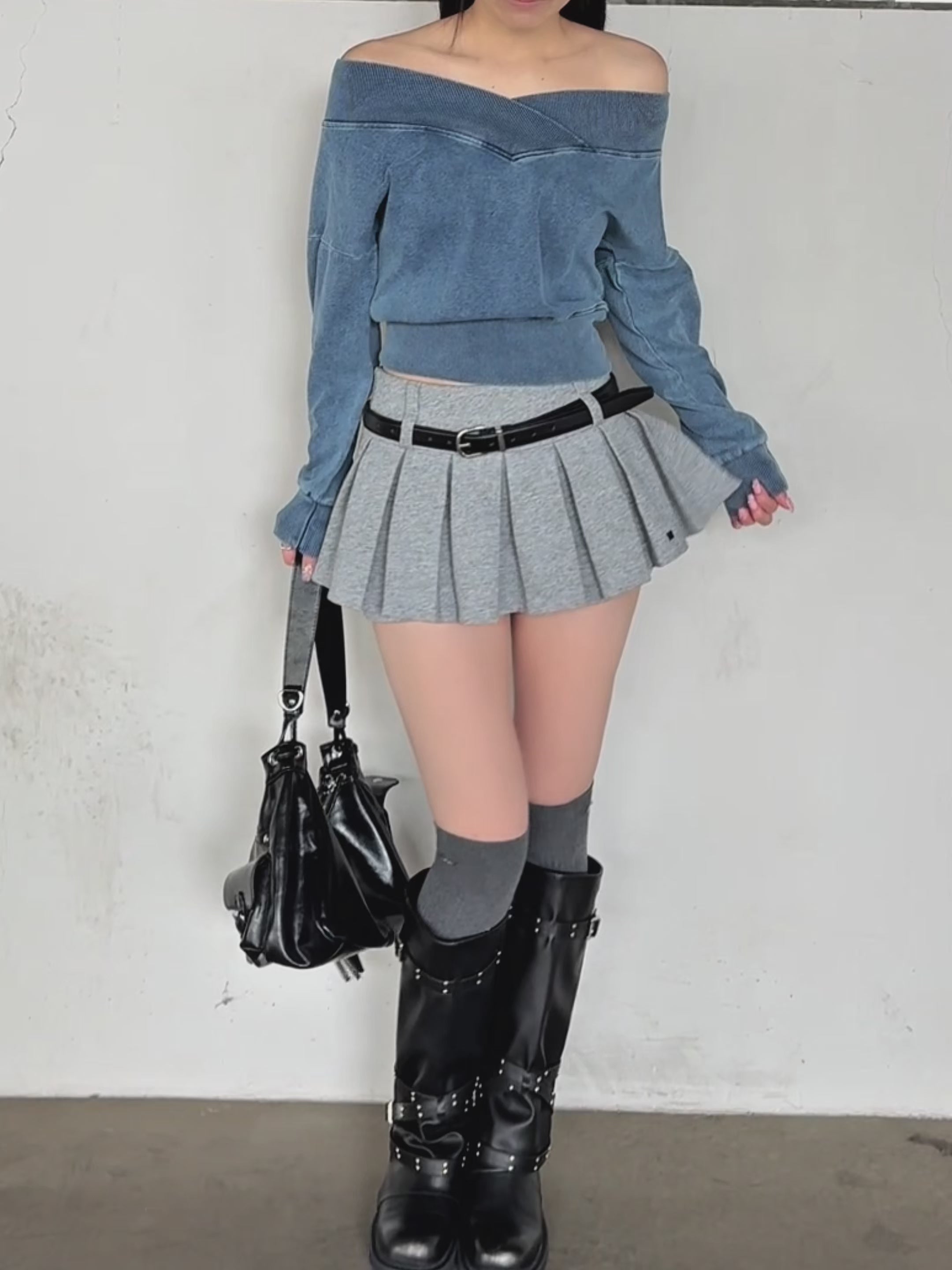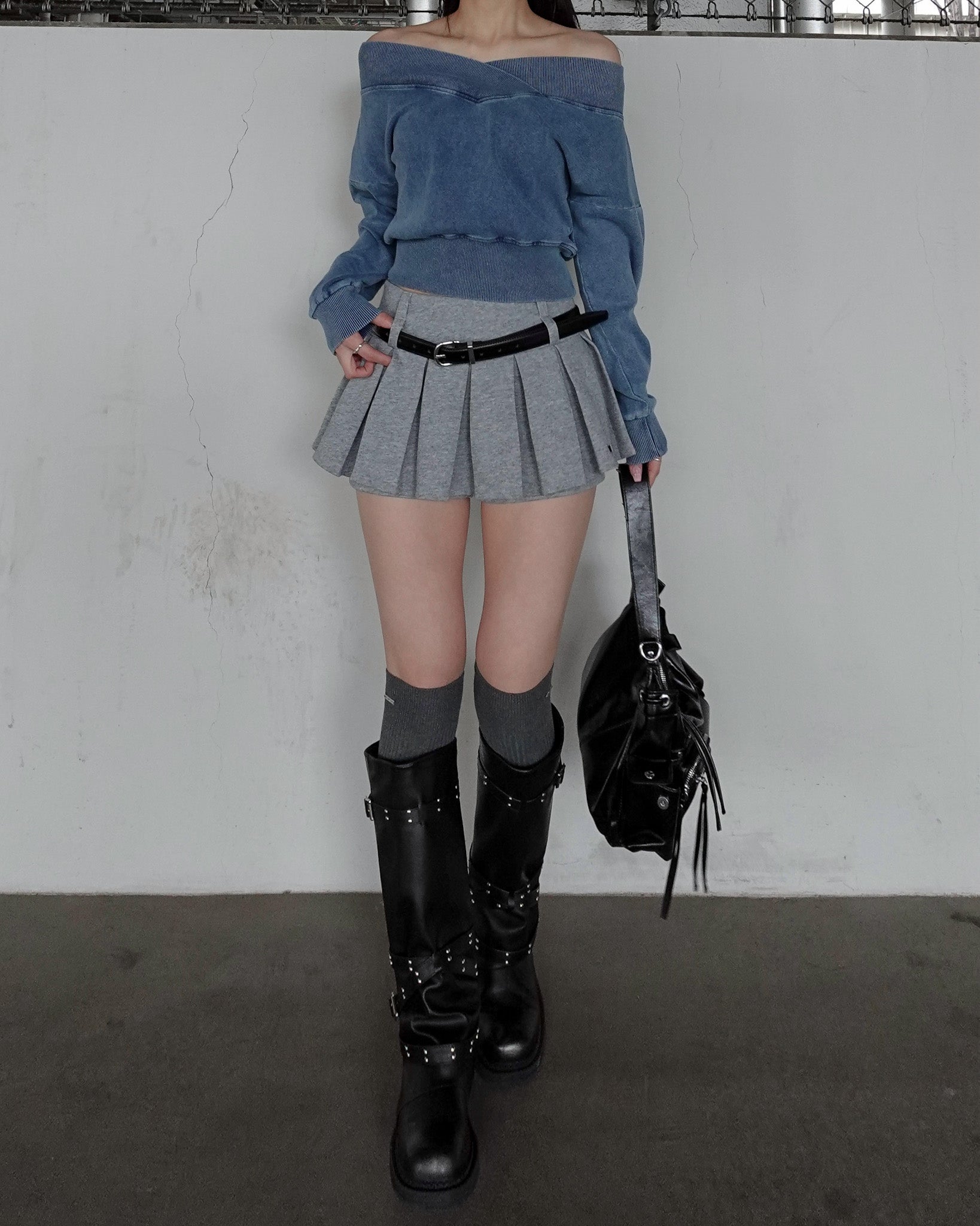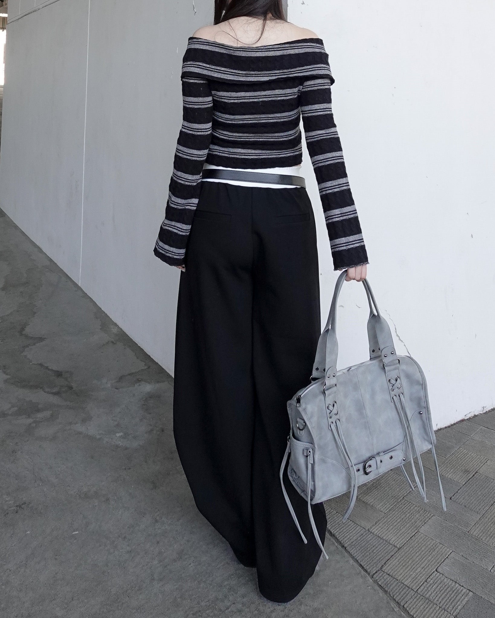 ショート丈のオフショルダートップス。