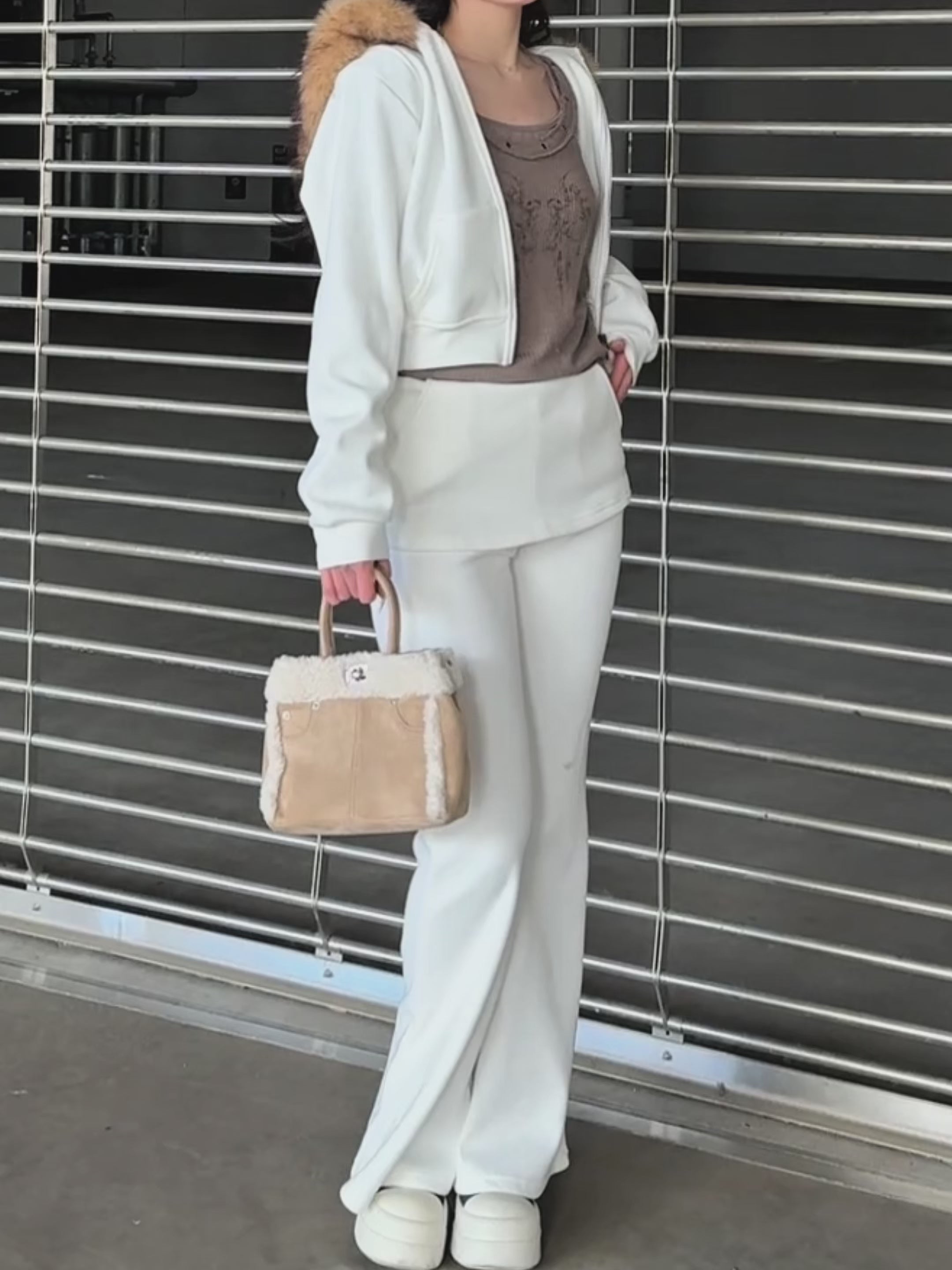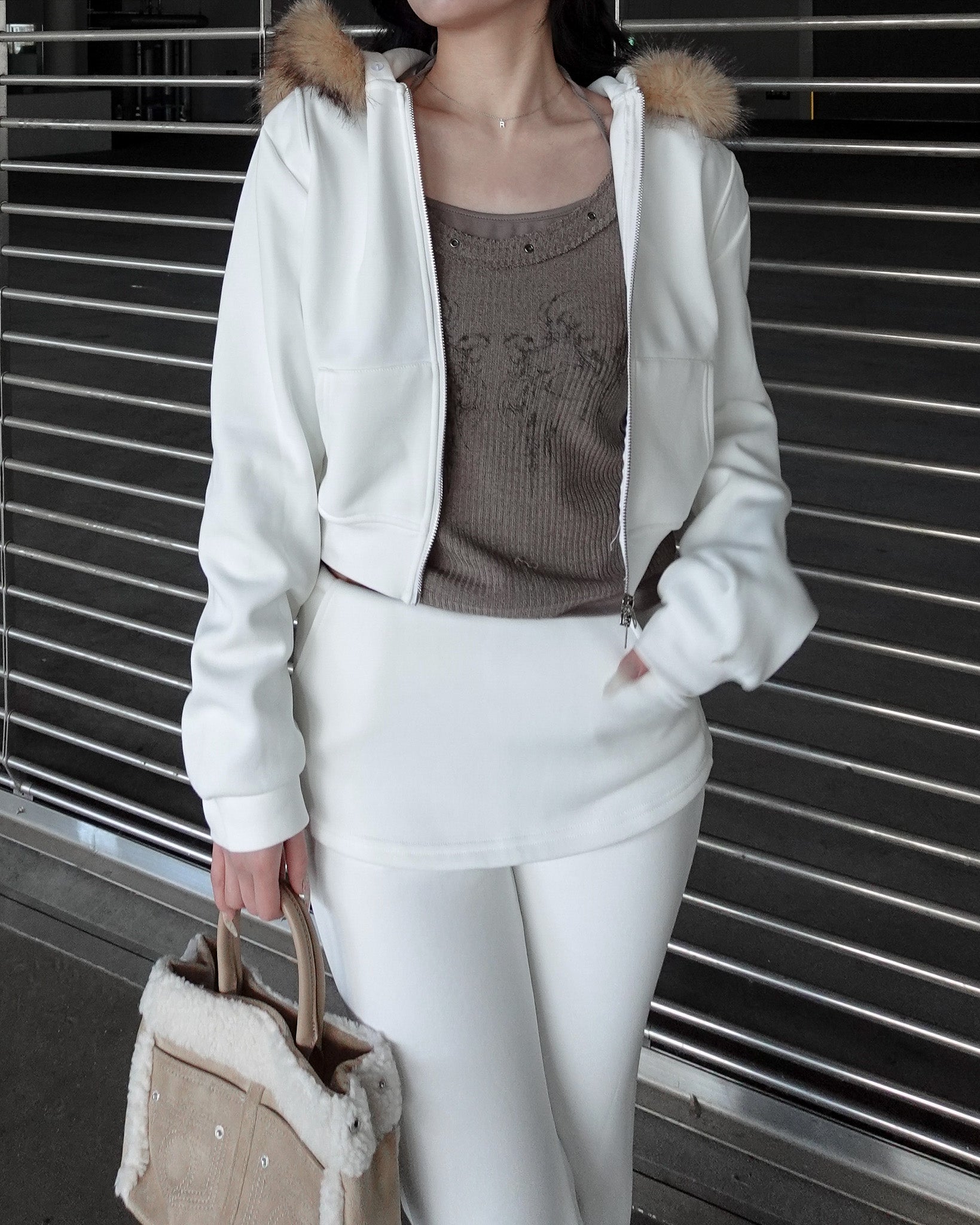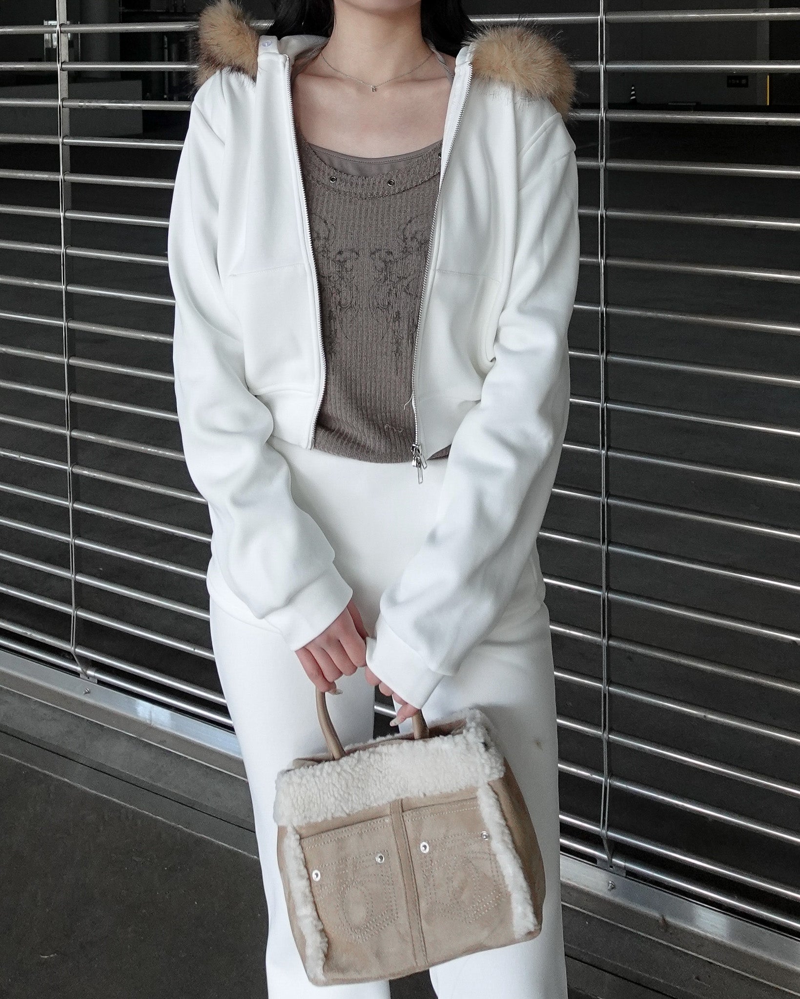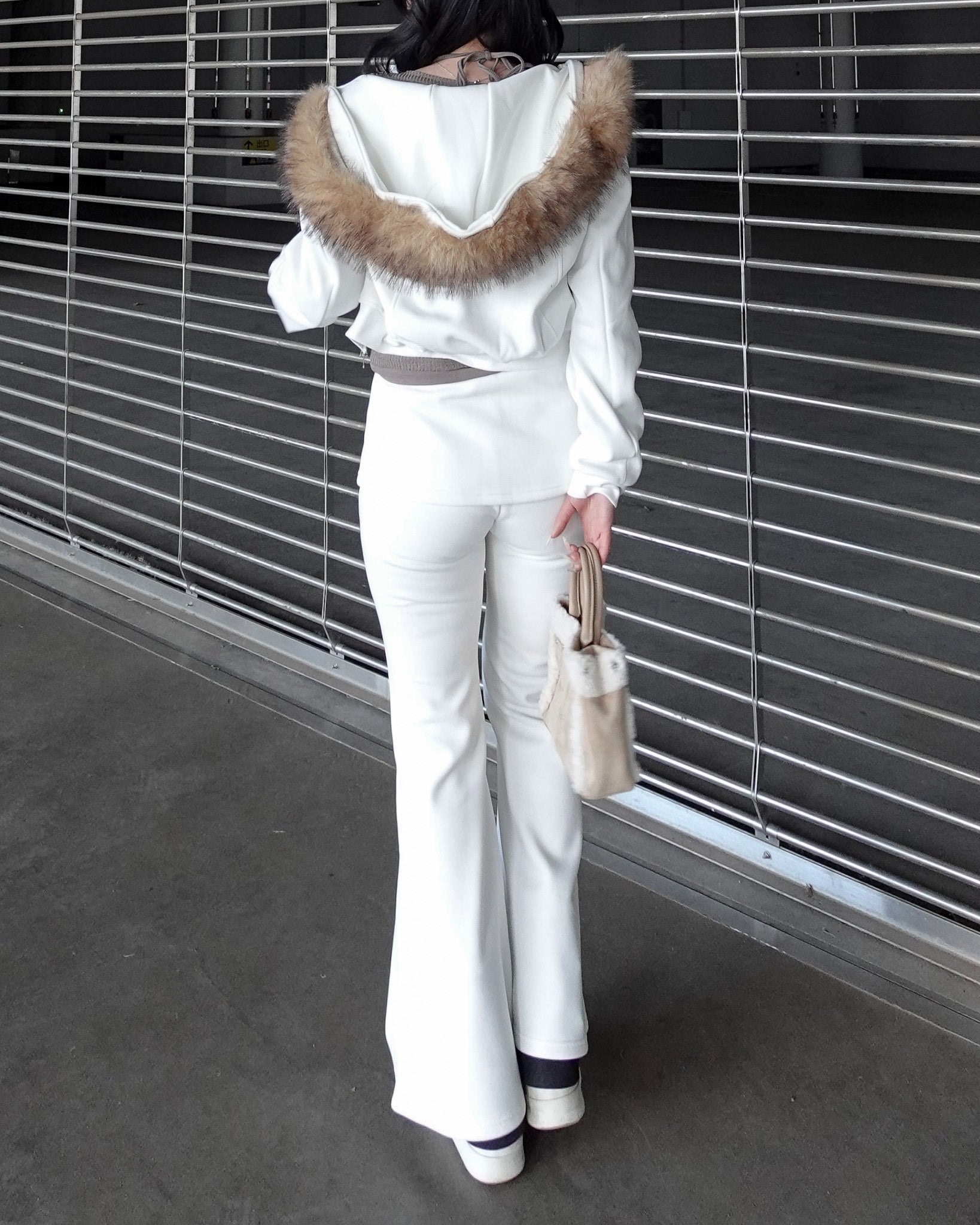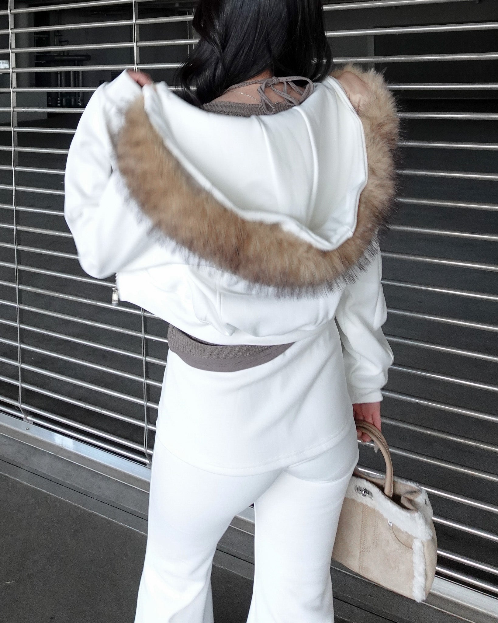 カジュアルな印象になりがちなセットアップも、ファーの存在感で一気に女性らしく