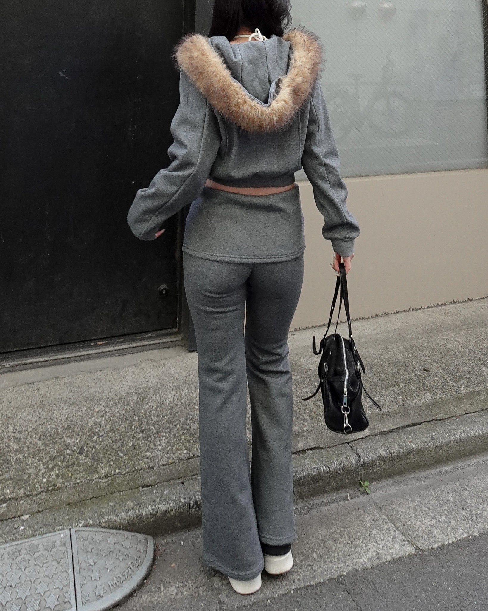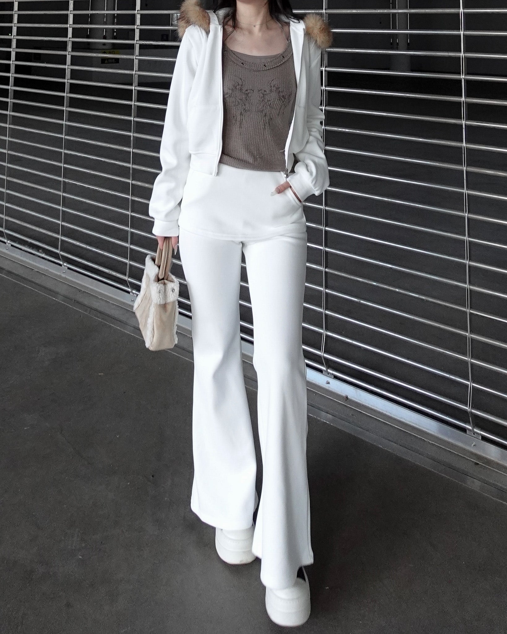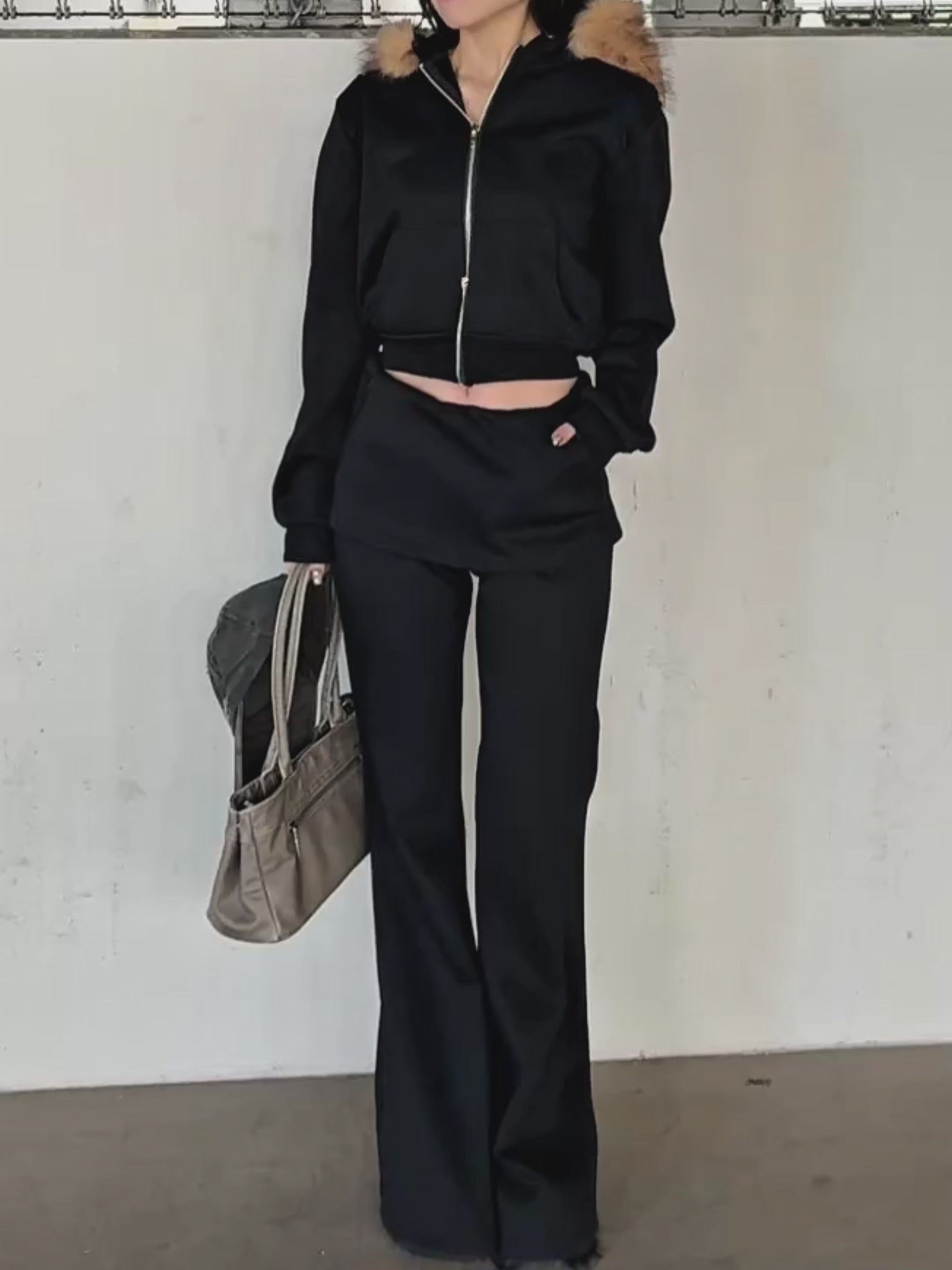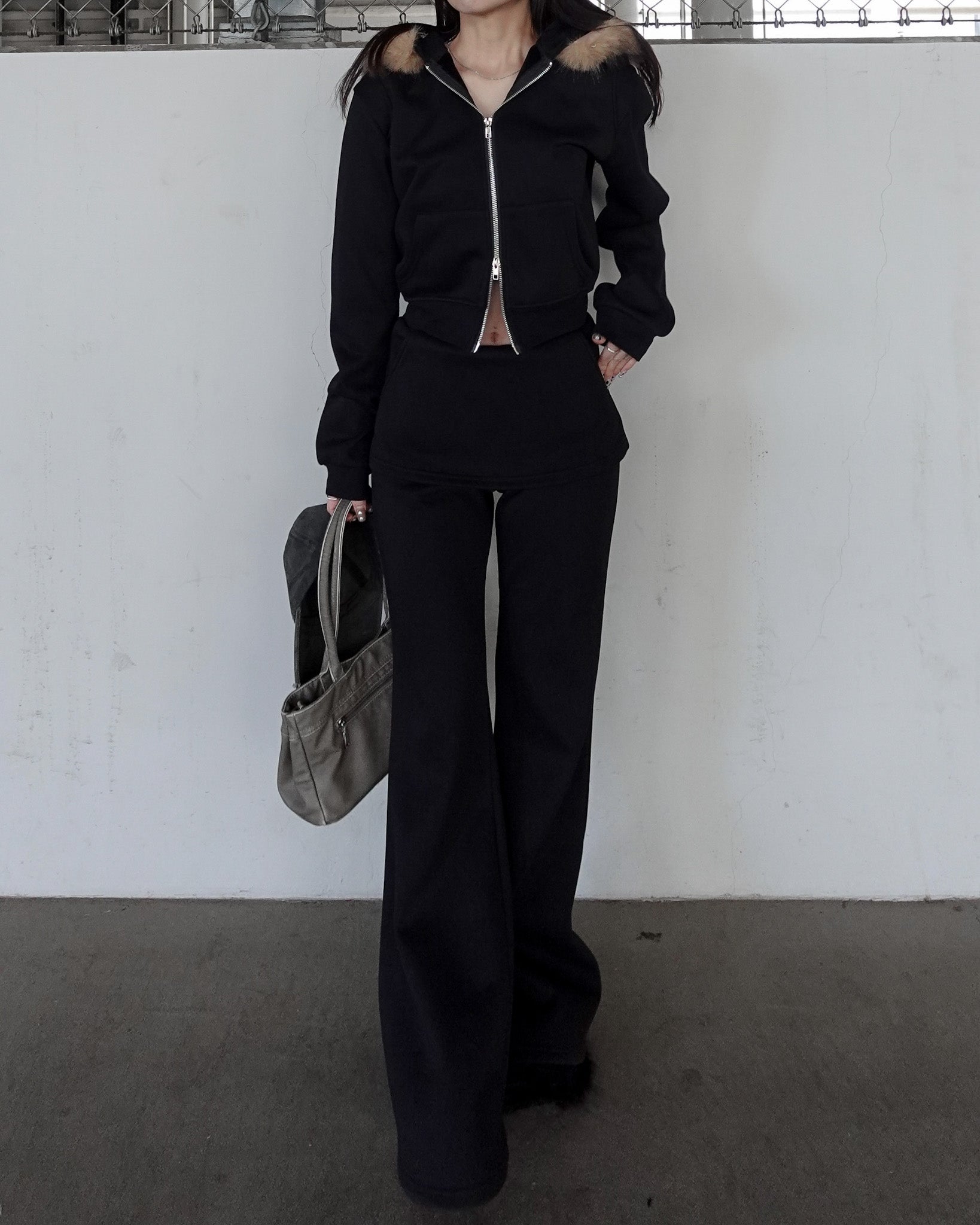 カジュアルな印象になりがちなセットアップも、ファーの存在感で一気に女性らしく