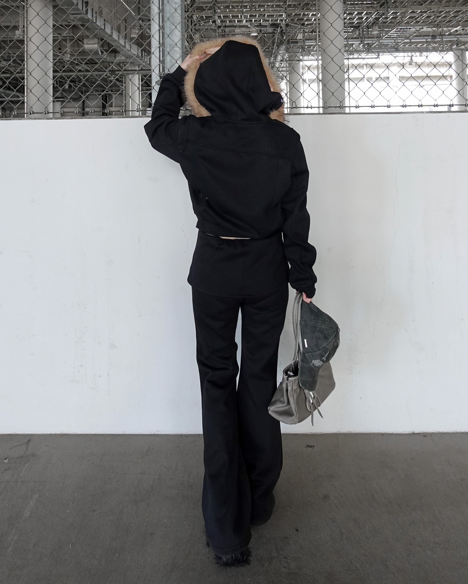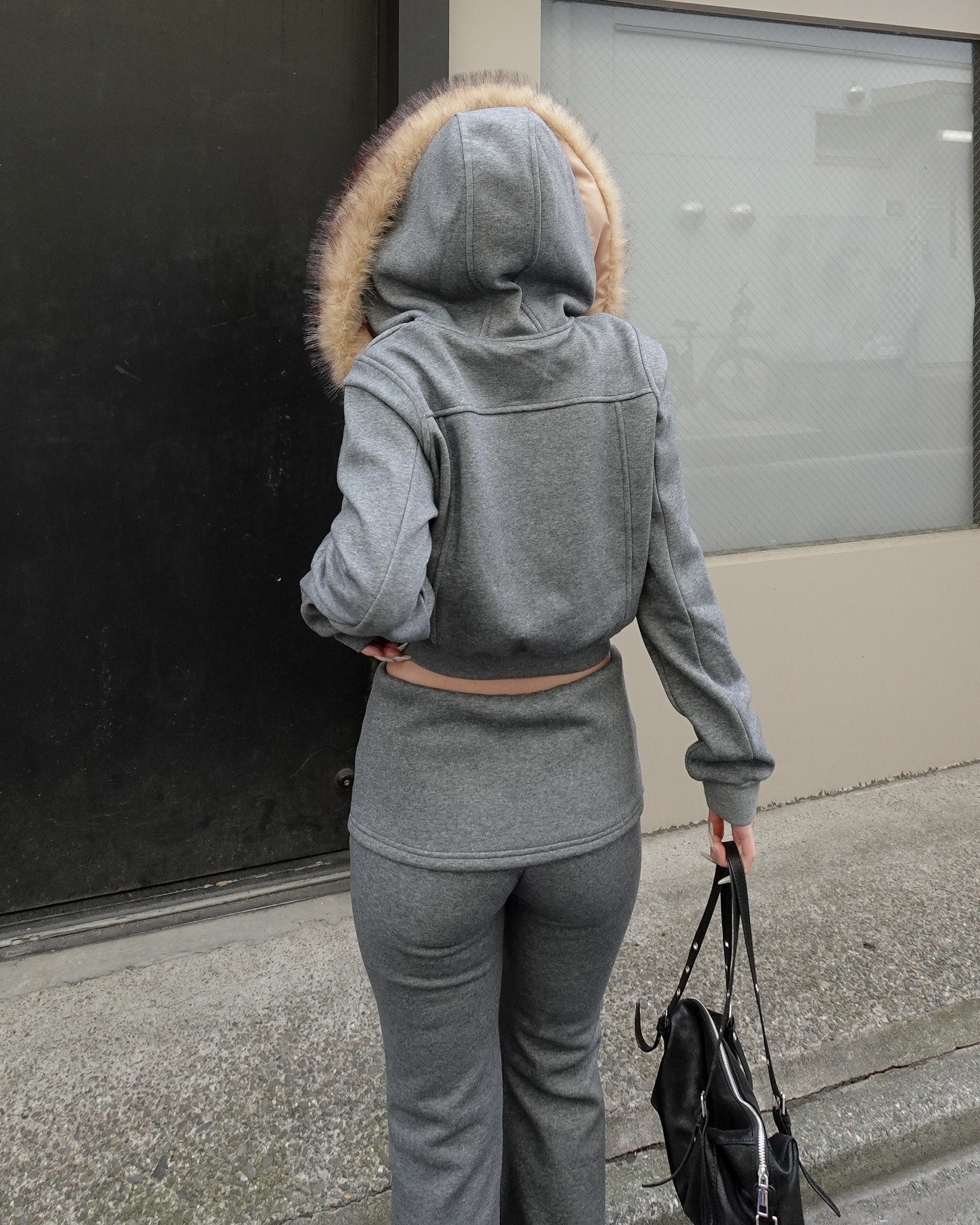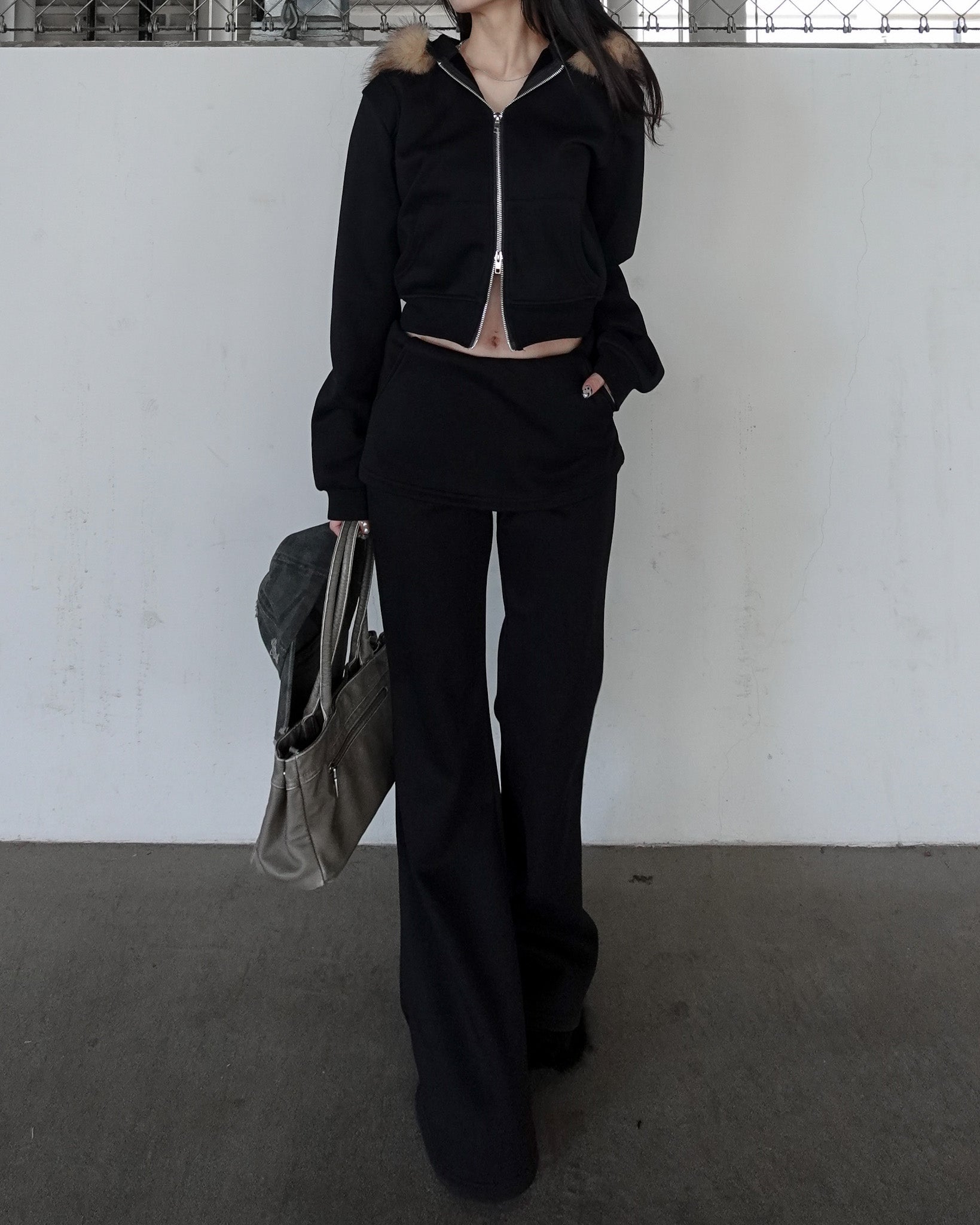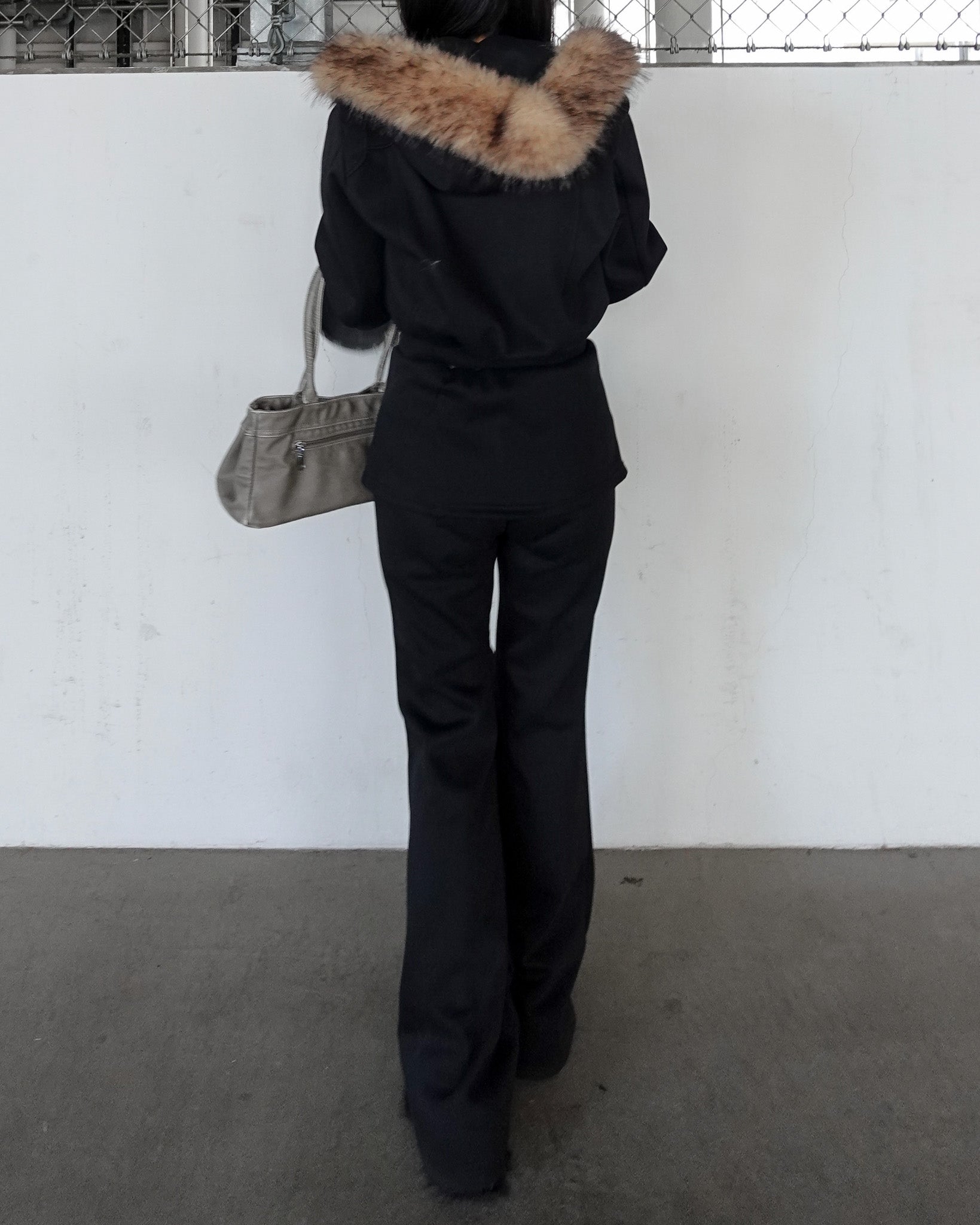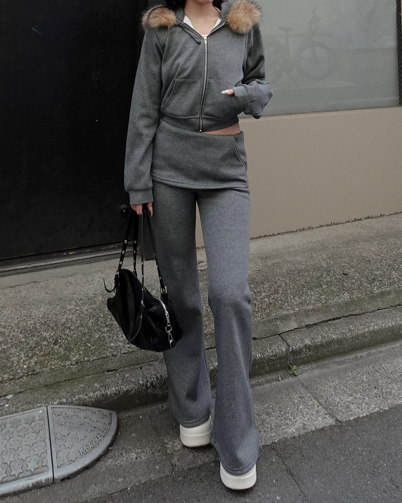 カジュアルな印象になりがちなセットアップも、ファーの存在感で一気に女性らしく