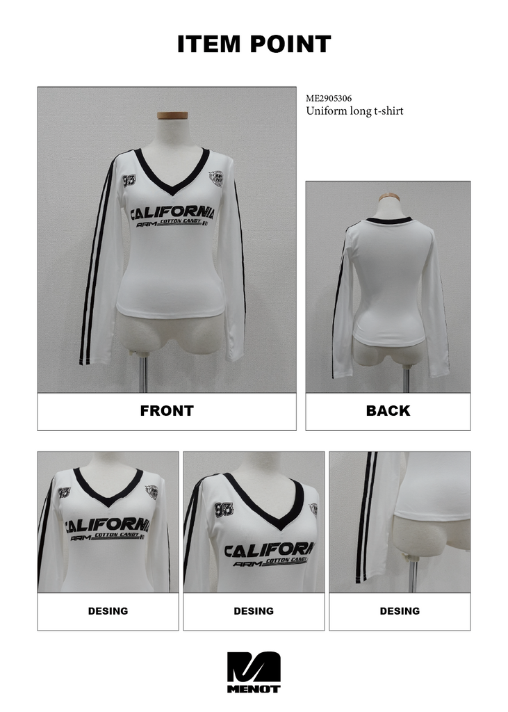 Vネックラインや袖に施されたラインデザイン、そしてロゴプリントが特徴です。