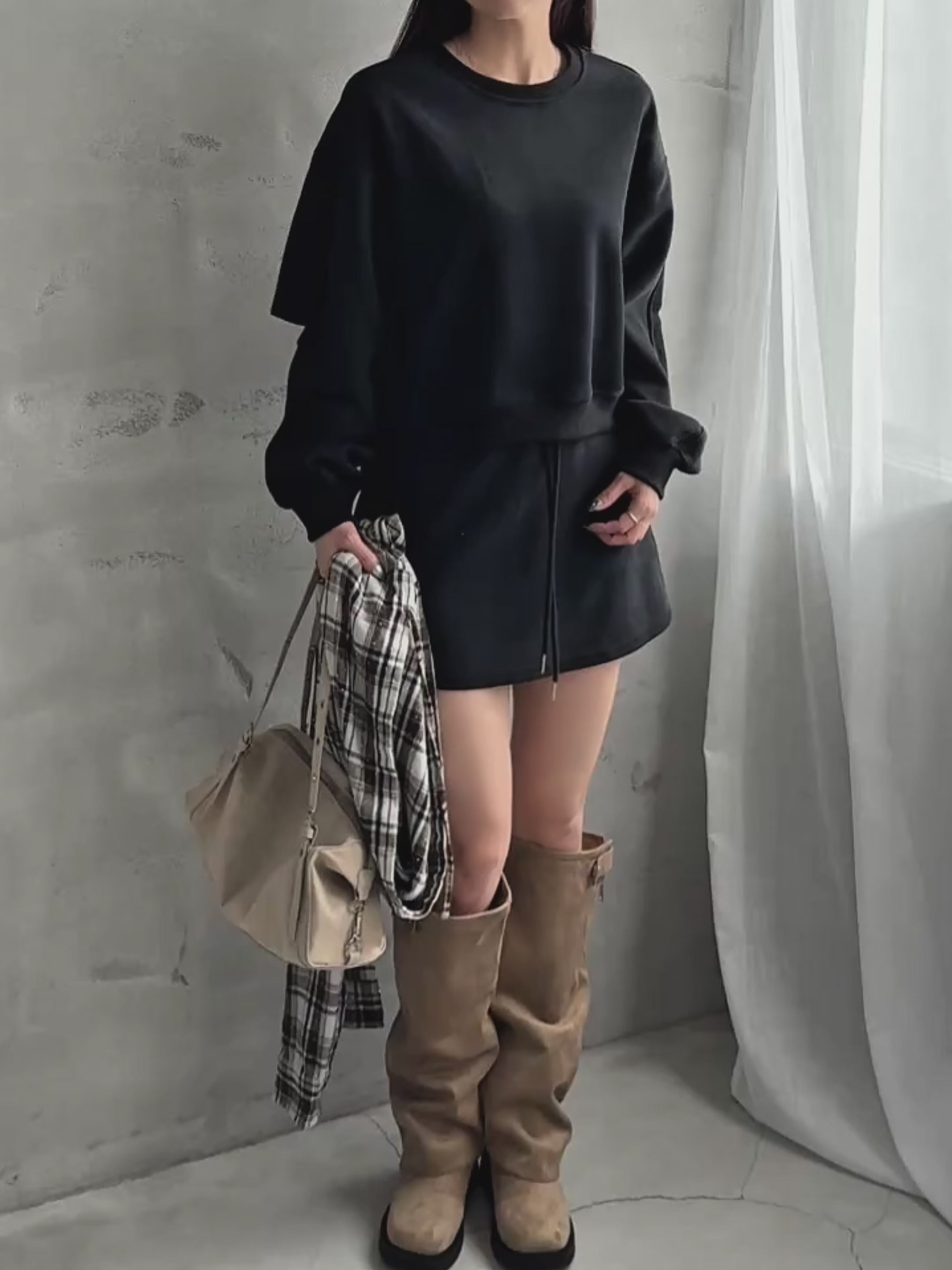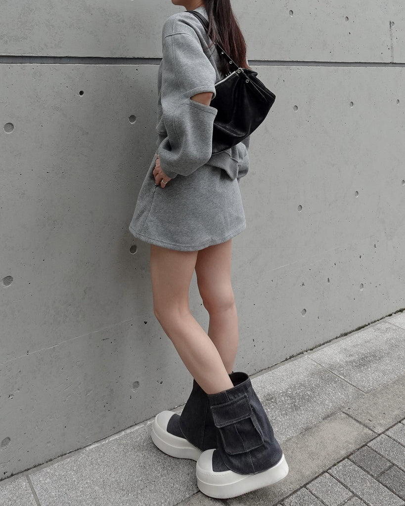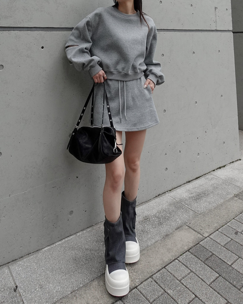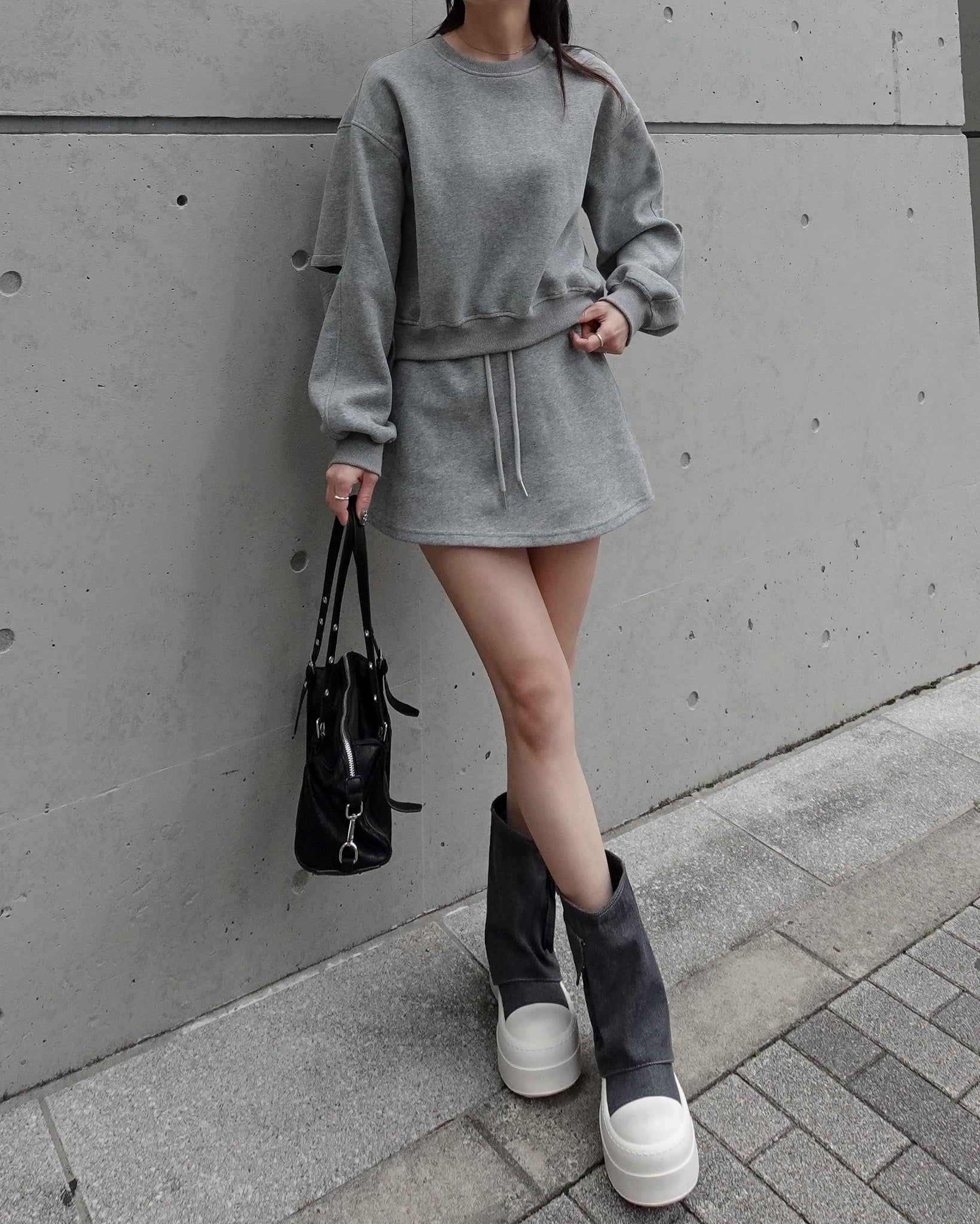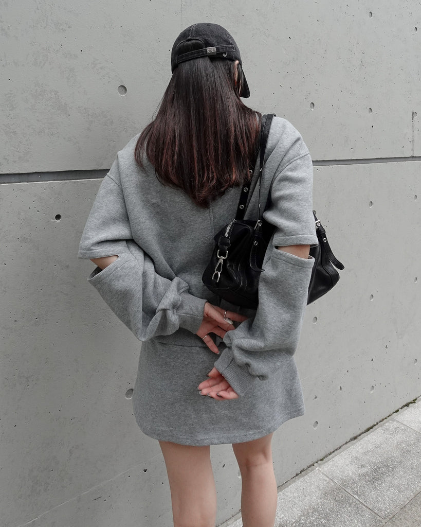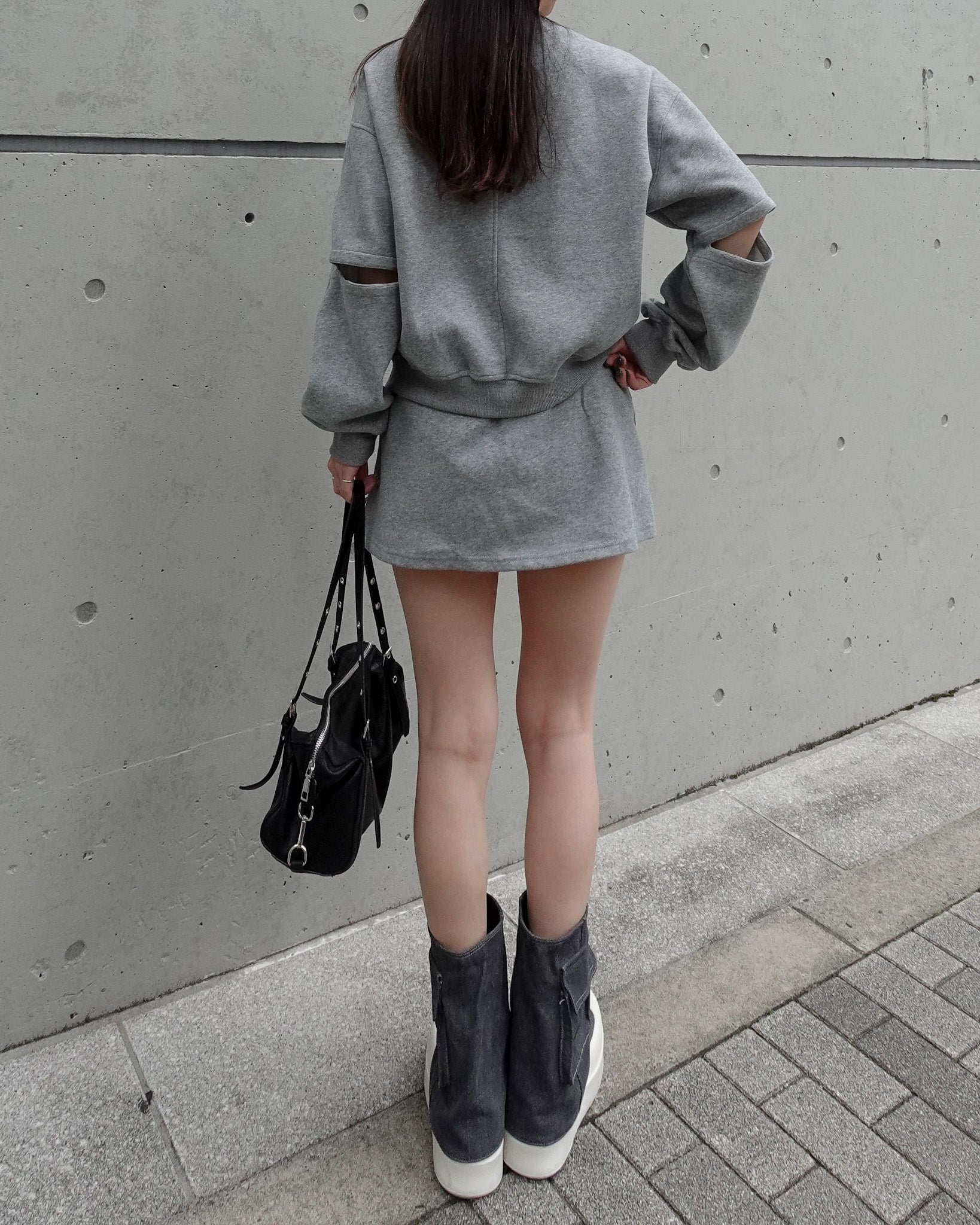 トップスは肘部分が開いたデザインで抜け感あるスタイリングに。