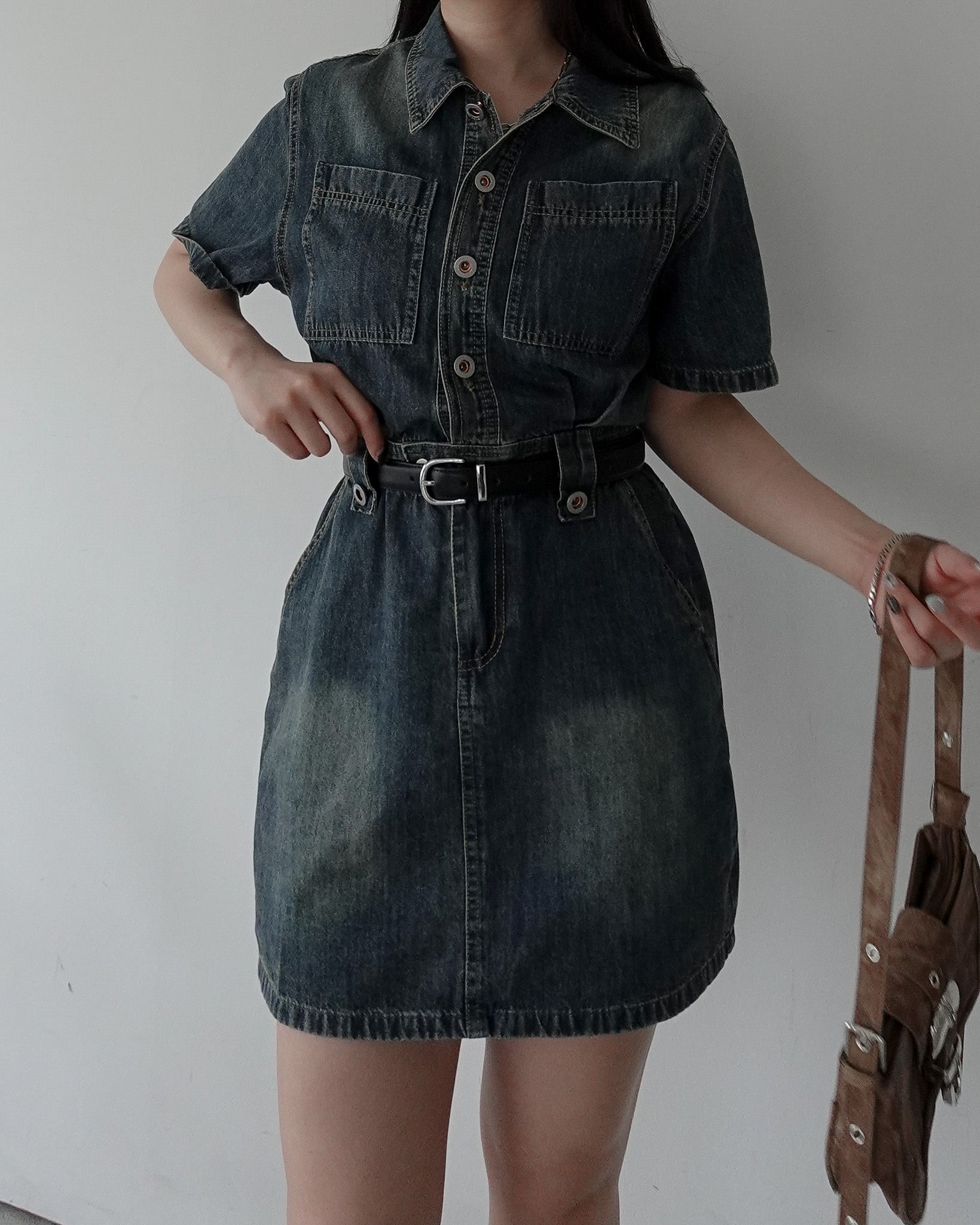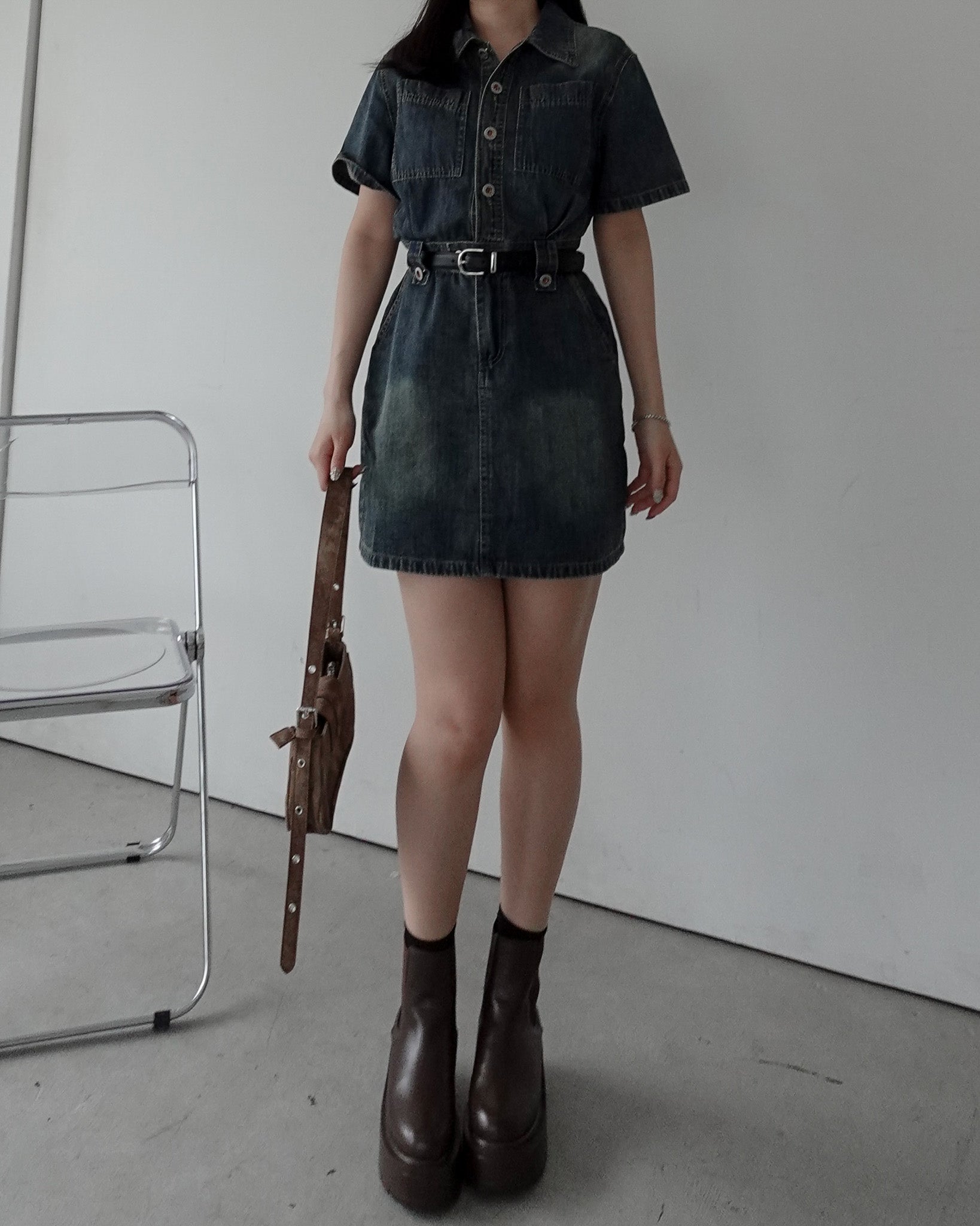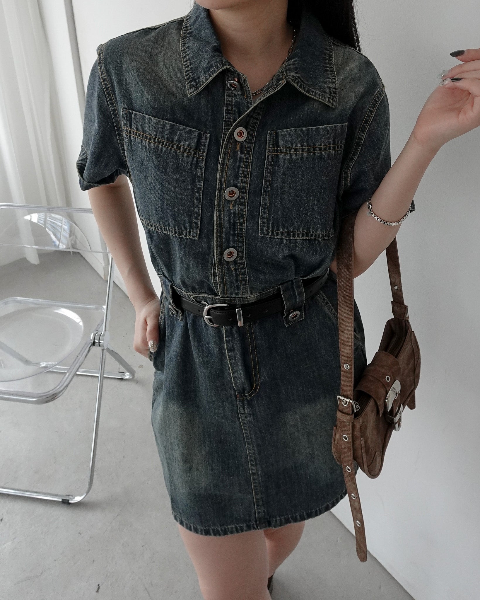 フロントボタンデニムミニワンピース