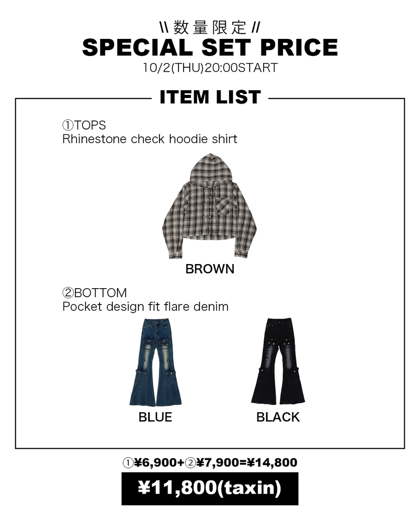 【3,000円OFF】ラインストーンチェックフーディシャツセット