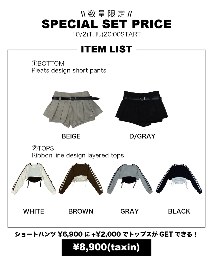 【プラス2,000円でトップスGET!】リボンレイヤードトップス×プリーツデザインショートパンツセット