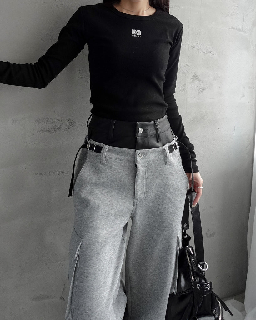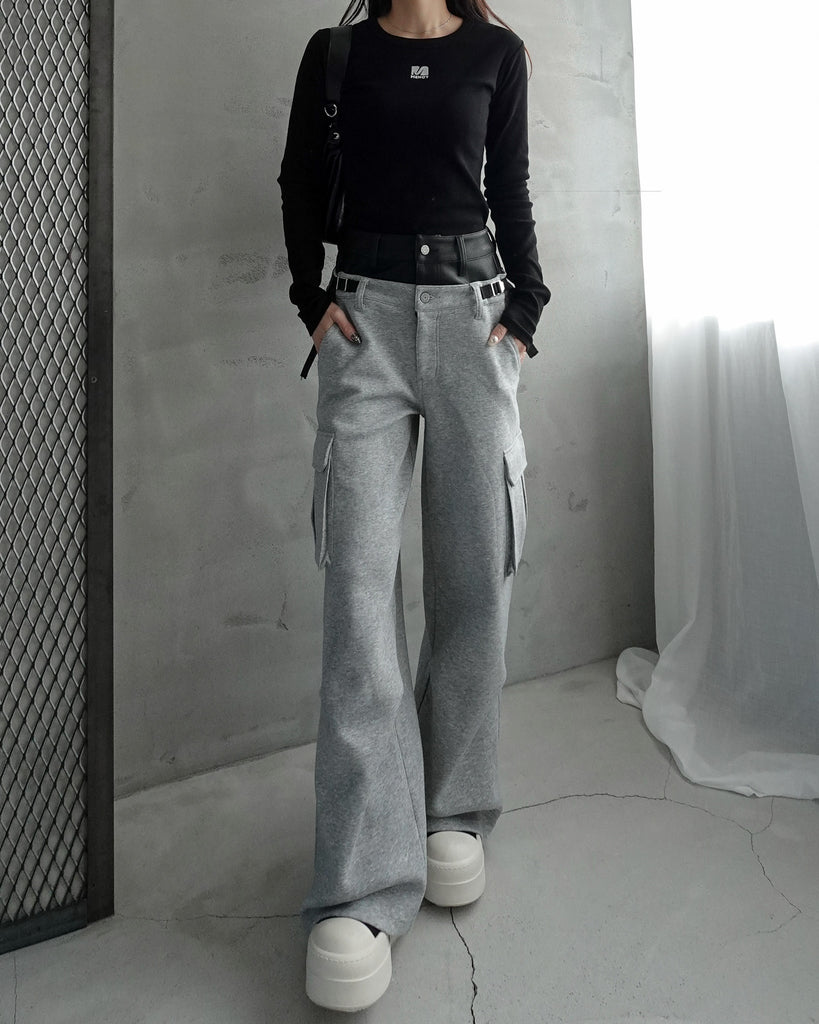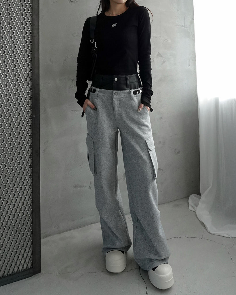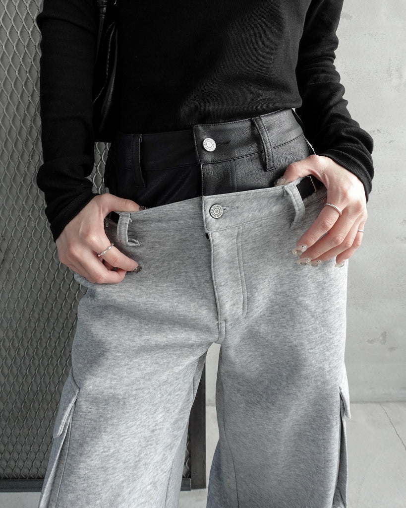 フェイクレザーを使用したダブルウエストがくびれと脚長効果抜群なデザイン。