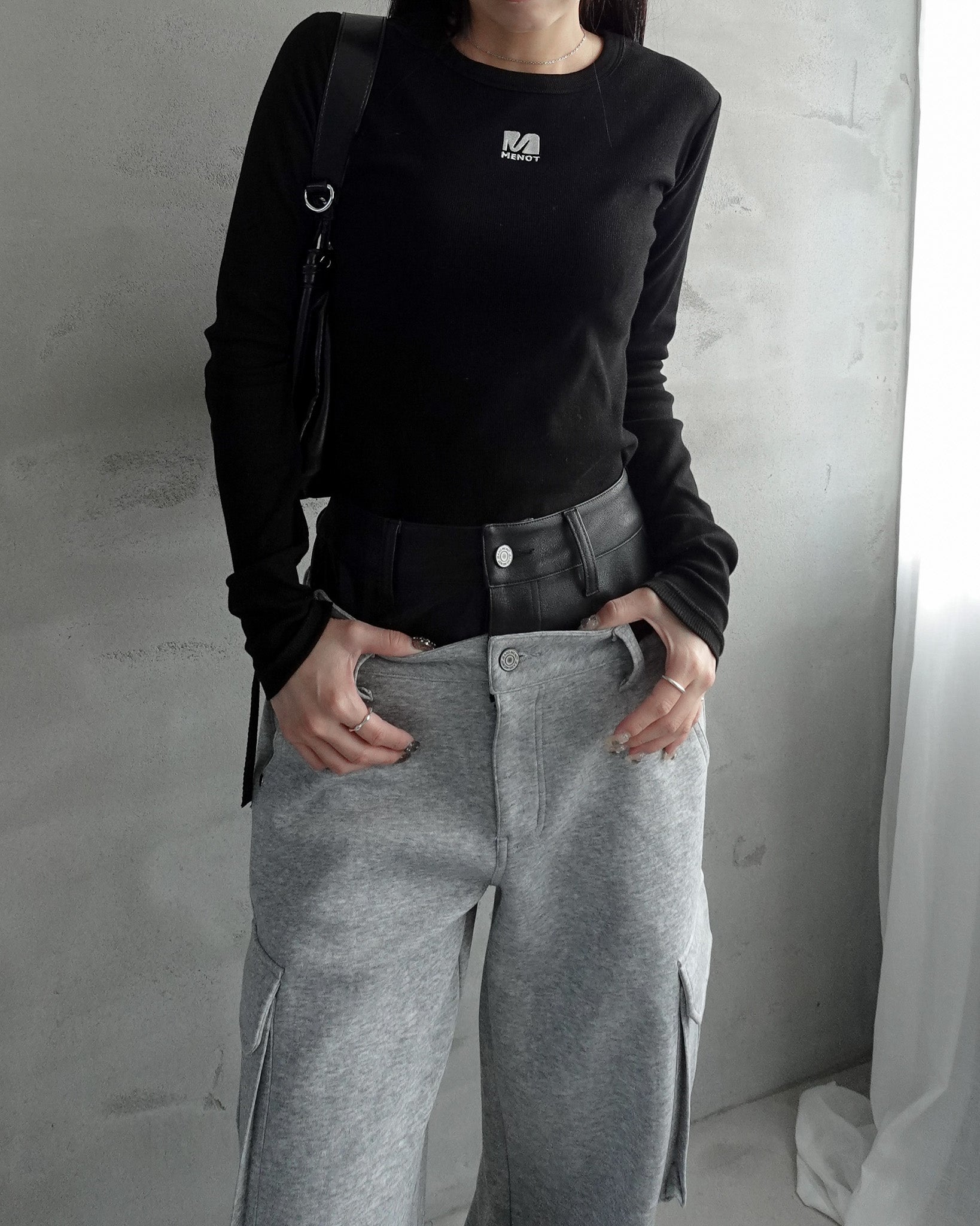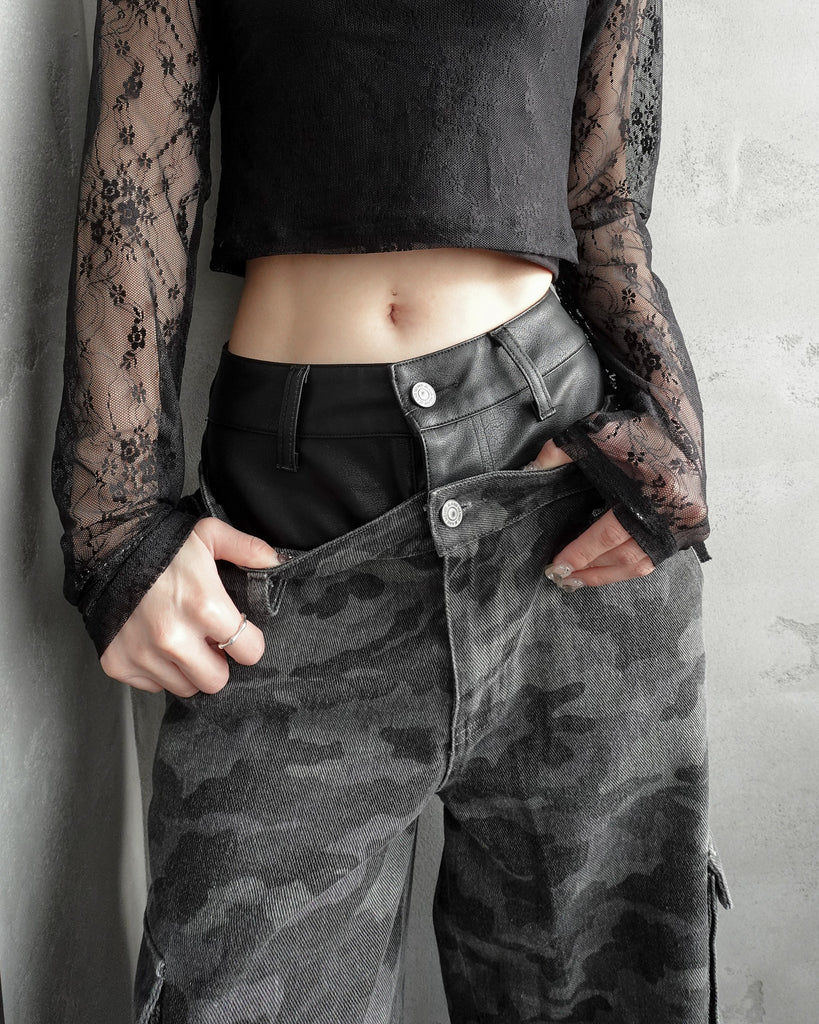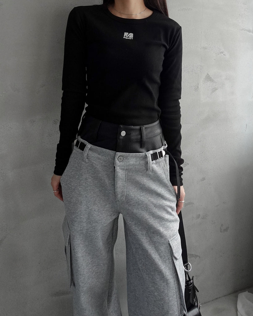 フェイクレザーを使用したダブルウエストがくびれと脚長効果抜群なデザイン。