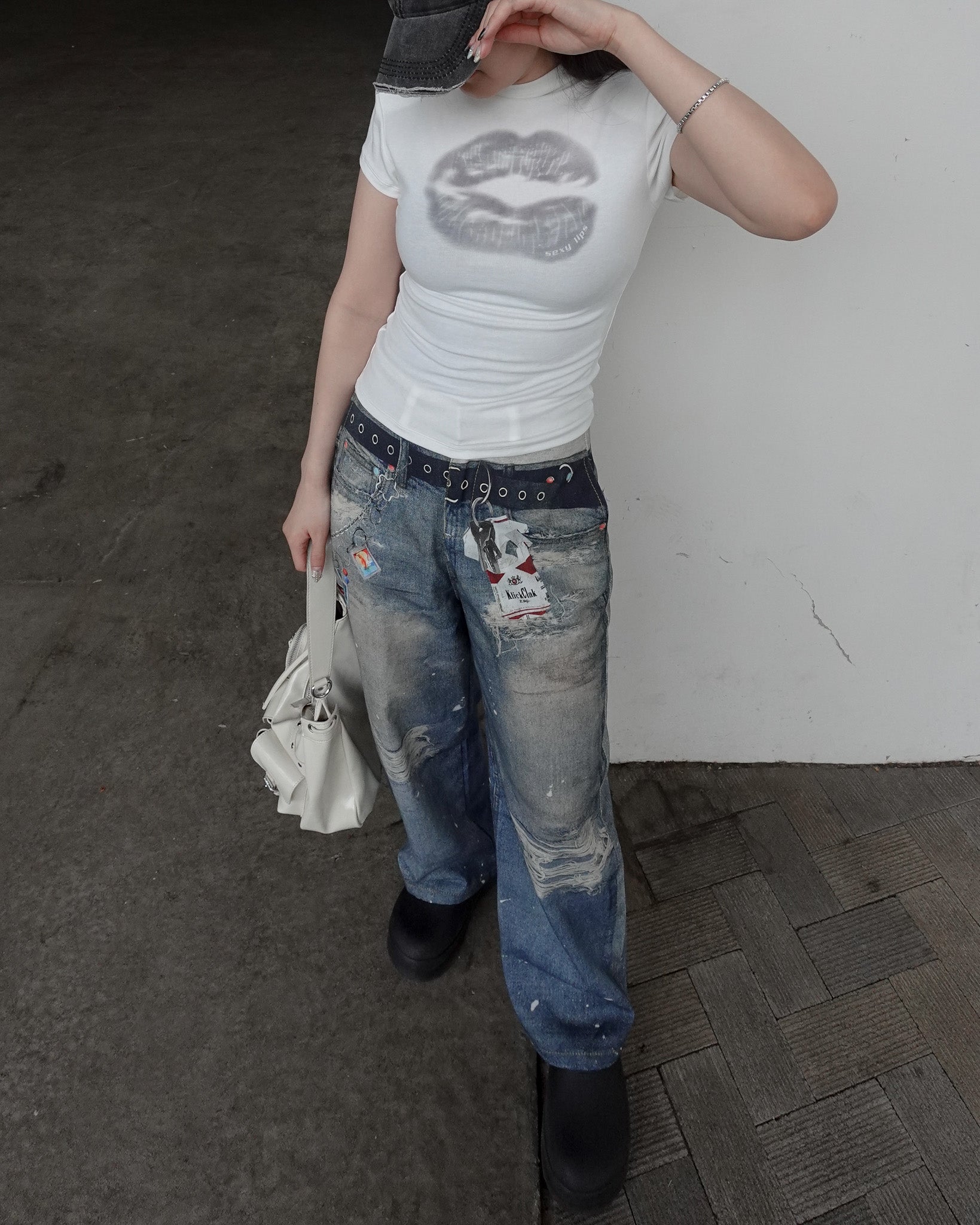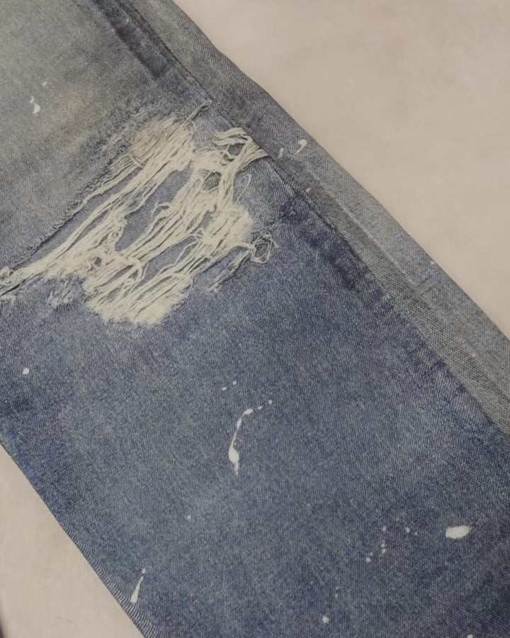 タバコモチーフのグラフィックが印象的なストレートデニムパンツ。
